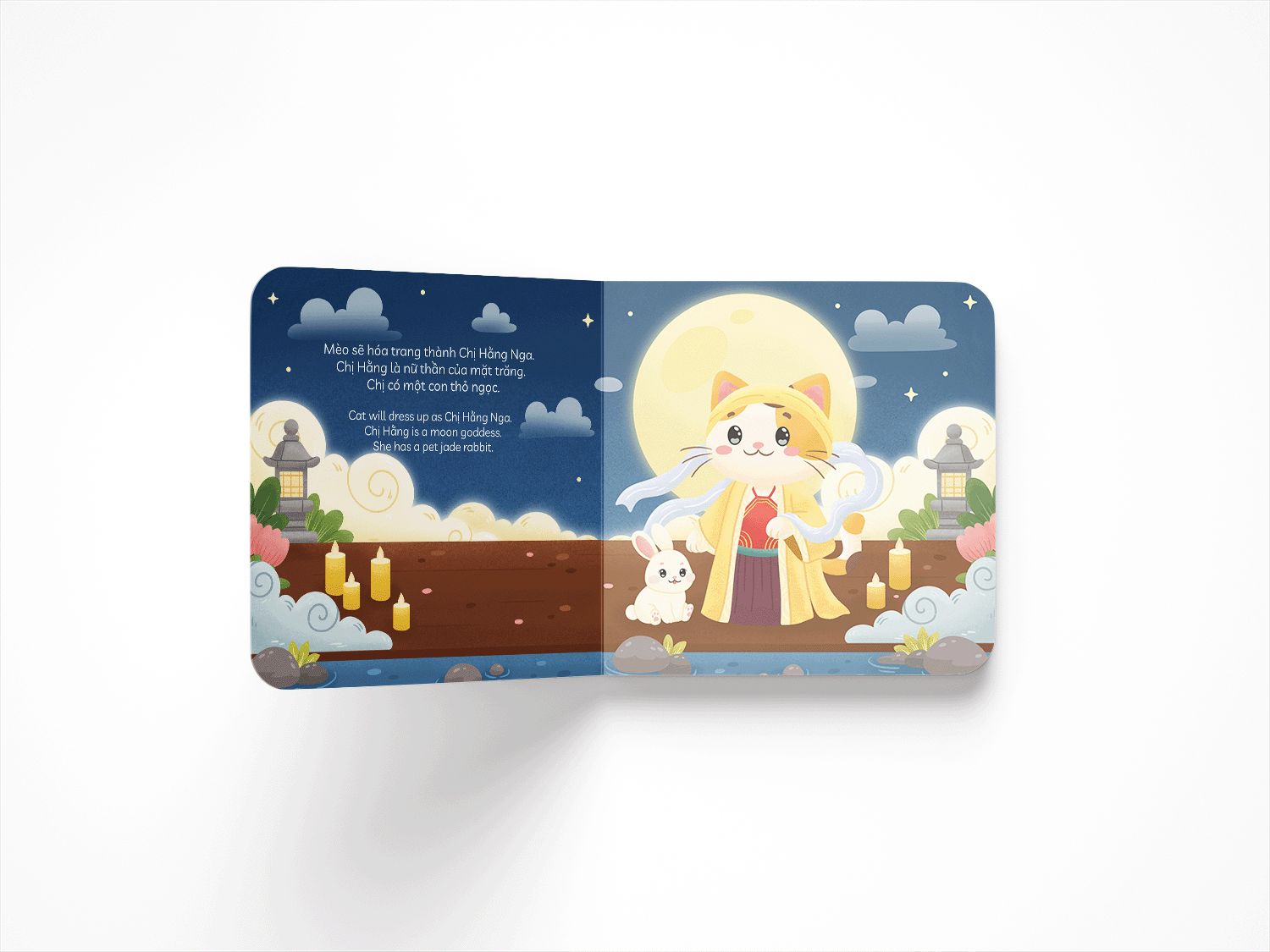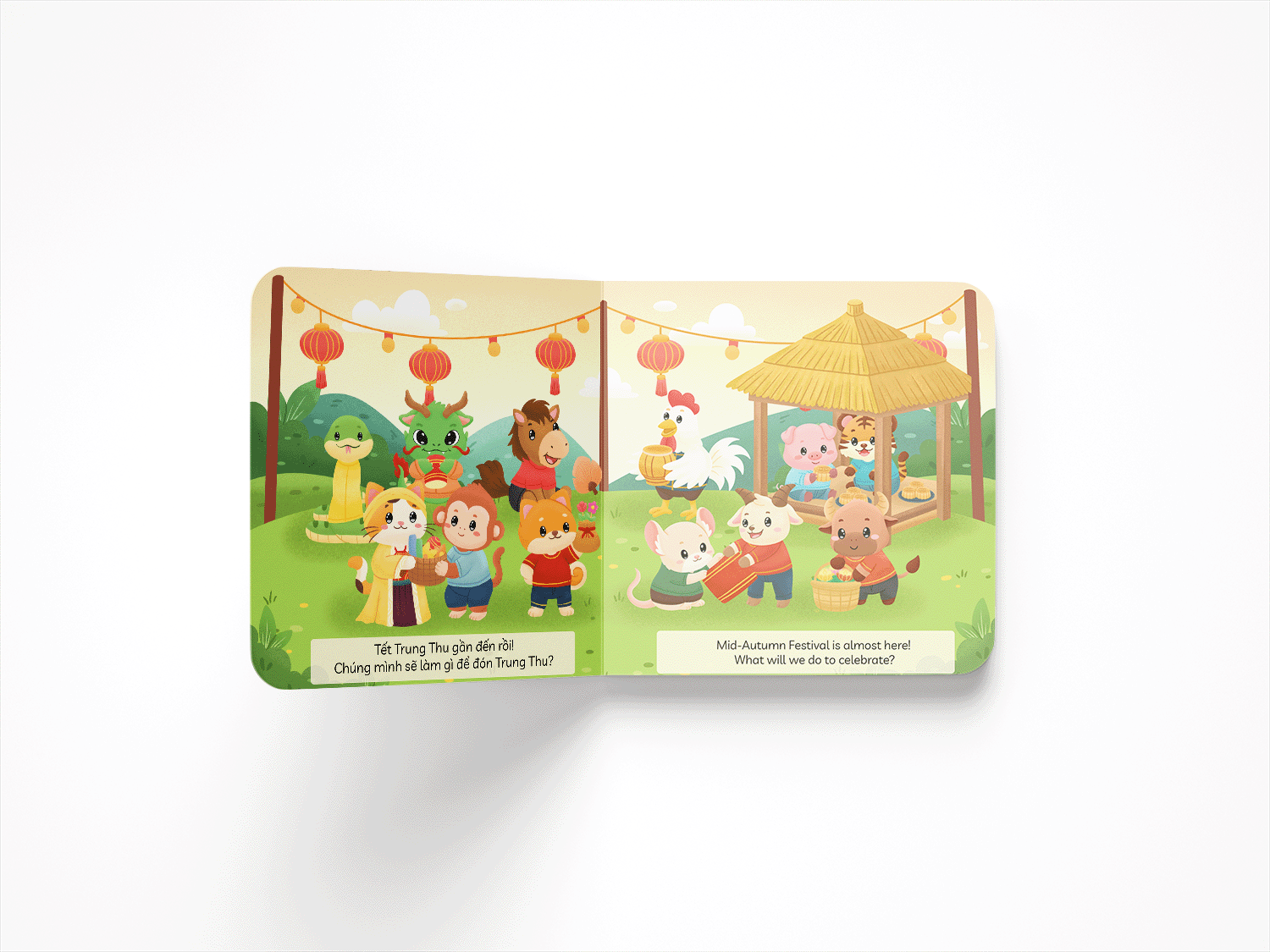 Read along as Rat makes lanterns from bamboo sticks and colored paper, see Cat dress up as the Moon Goddess (Chị Hằng Nga), and watch Dragon and Snake perform the lion dance (múa lân) with Horse acting as the Earth God (Ông Địa).